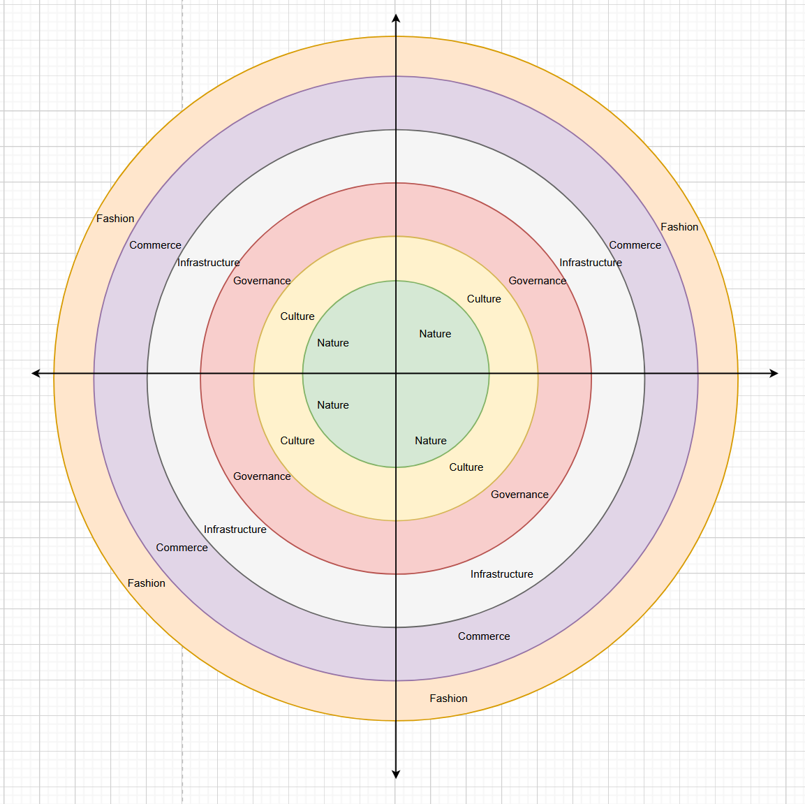 In his book, The Clock of Long Now (Brand, 1999), Stewart Brand explains the idea behind what he calls Pace Layers, a systems theory about robust and adaptive systems and how we can best understand the timescales within which humans are situated. He imagines six concentric circles, each representing an independent layer on a different timescale from the others but interacting with their neighbors in a way that keeps the system adaptive, robust, and resilient (Brand, 1999),). From the slowest at the center to the fastest at the outside, Nature, Culture, Governance, Infrastructure, Commerce, and Fashion (NCGICF) move at “at their own pace, safely sustained by the slower levels below and kept invigorated by the livelier levels above.”( Brand, 1999))